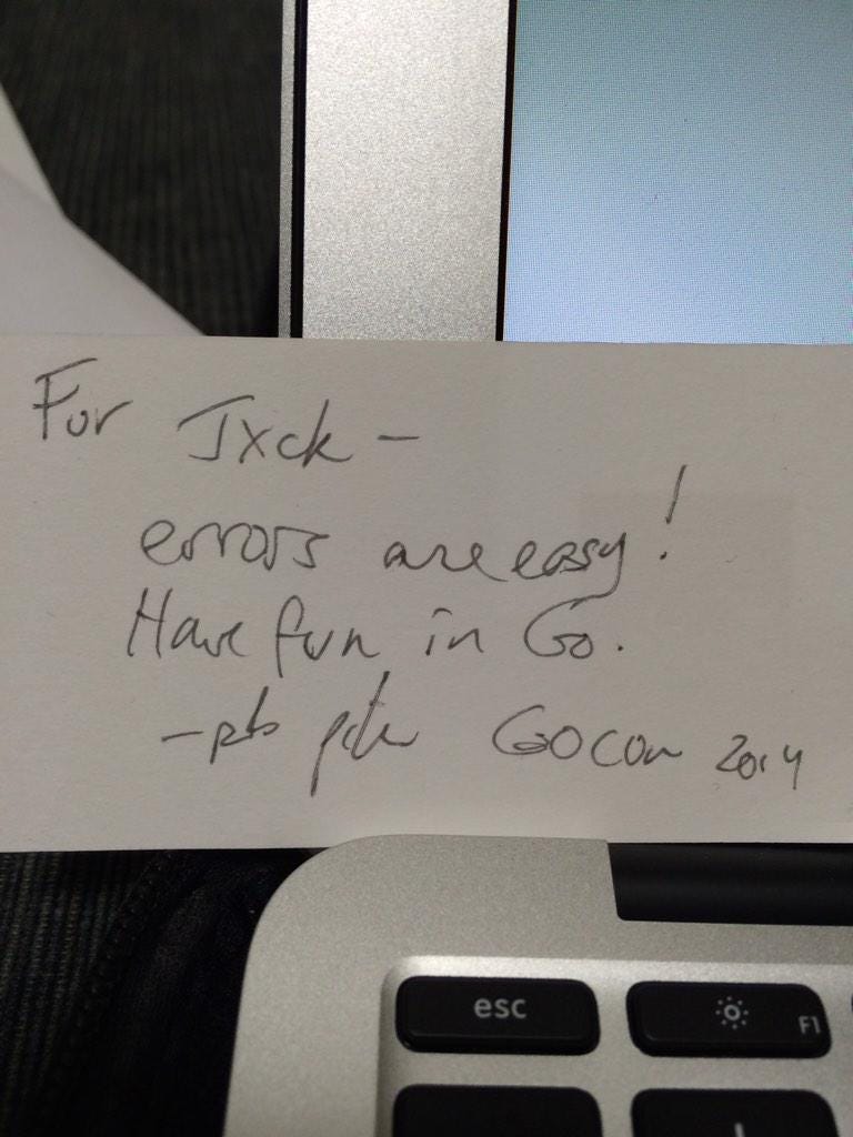 if err != nil {}代码,导致code smells。相信我,那是因为你的功力不足,当然我也是这样。早在 2014 年有个日本程序员@jxck_在 GoCon 上吐槽这个错误处理,然后 Rob Pike 大神 (Go 作者之一)现场亲自给这哥们重构代码,所以有了这篇博文。这位日本程序员的 Blog 记录了当时的视频。 #Golang 一个好玩的事情, Rob 在这里也讲当时为啥要亲自给他写 "I mentioned this technique in our discussion but@jxck_didn’t see how to apply it. After a long exchange, hampered somewhat by a language barrier, I asked if I could just borrow his laptop and show him by typing some codes." 在我看来这是在吐槽日式英语么。:)